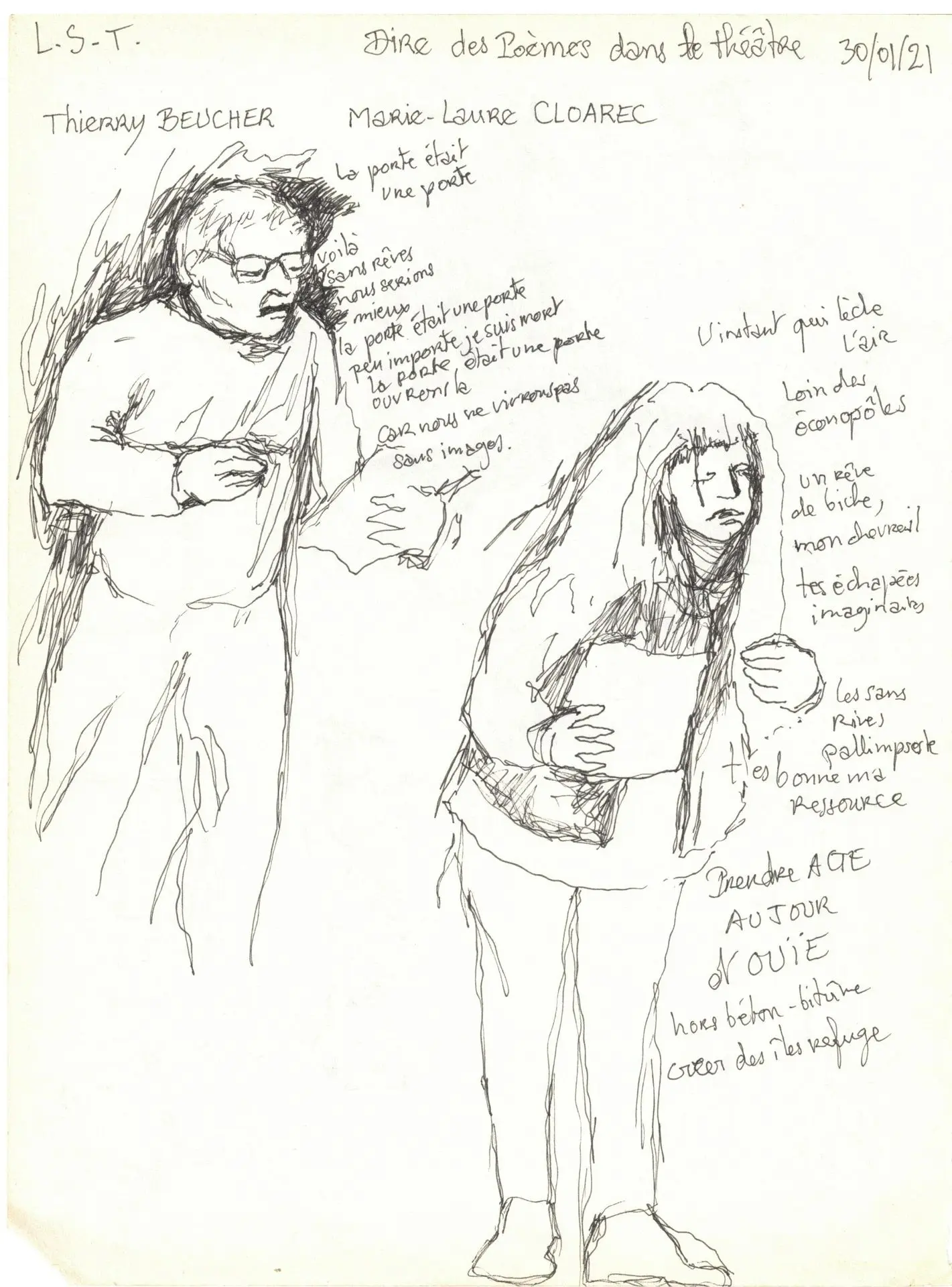 Par la marche, l'exploration du territoire et l'observation, dans le cadre de rencontres et ateliers d'écriture avec les habitant.es et par l'entremise du personnage fil rouge de la Compagnie, Philomina, Marie-Laure recueille une matière faite de mots, de paroles, d'échanges de présences et de regards, d'impressions et d'émotions. A partir de cette matière, elle compose, en poésie, différentes formes de "paysages d'humanités".